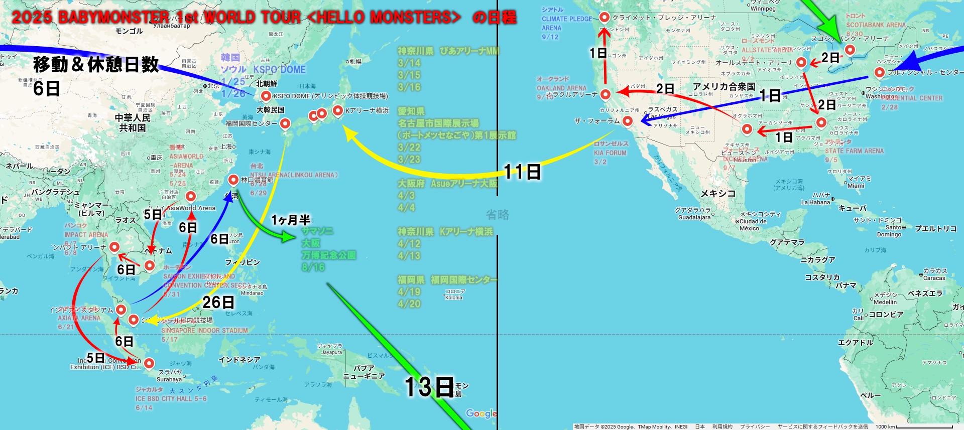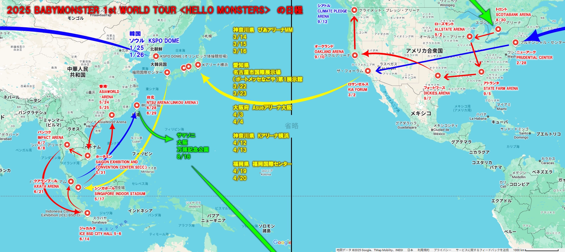今回はそんな第5世代K-POPガールズグループのBABYMONSTERのワールドツアー、2025 BABYMONSTER 1st WORLD TOUR <HELLO MONSTERS> の日程を地図化させて頂きました。