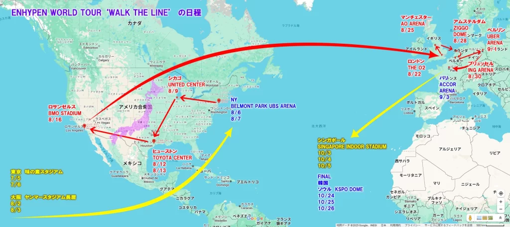 それが思いのほか、ブログ主にとっても勉強になったり気づきになったりして面白かったし、視覚化することでファンの方の一助にもなっているようで、一挙両得というか一石二鳥なことが判明したのでENHYPEN WORLD TOUR ‘WALK THE LINE’(-SUMMER EDITION-)についてでも経路図を作ってみることにしました。