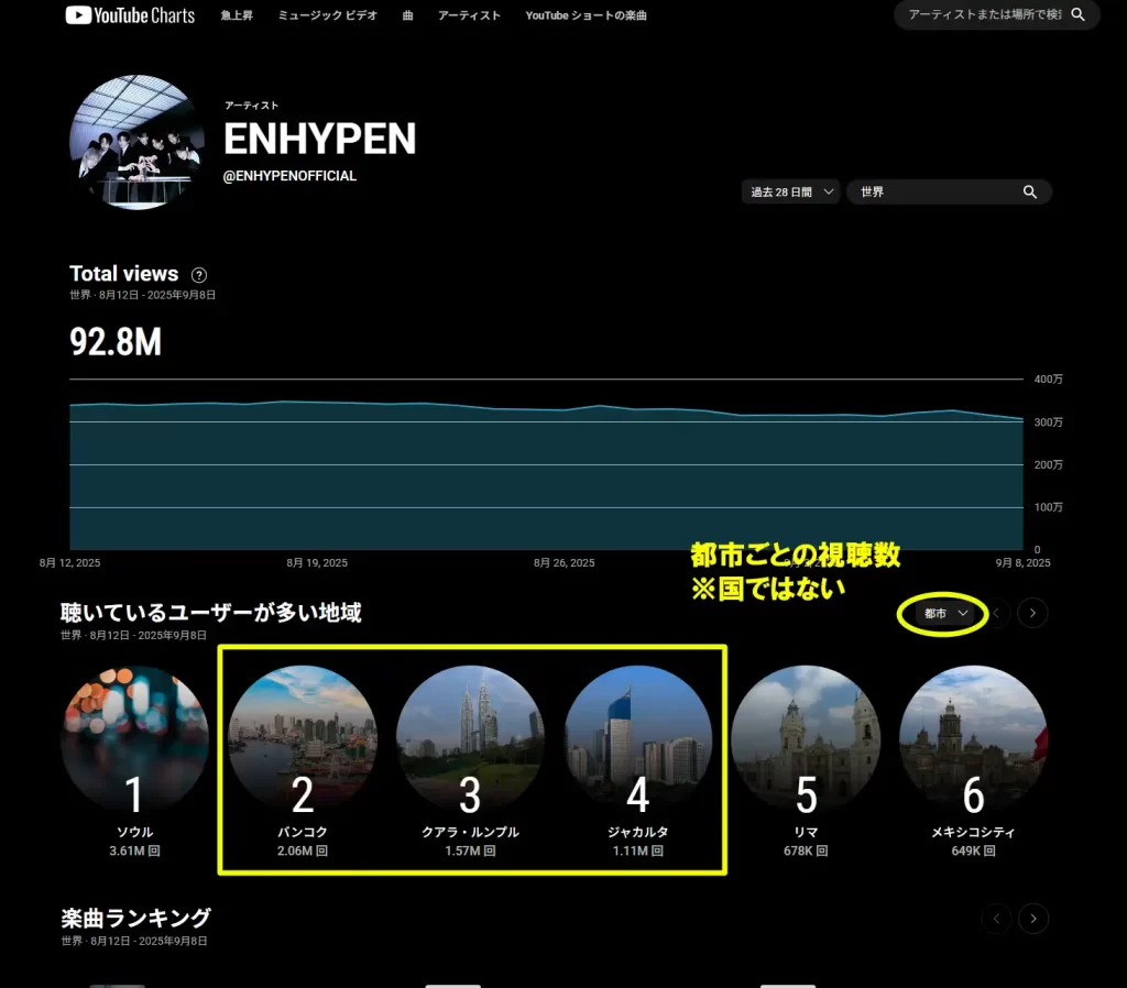 都市ごとの視聴数で、韓国ソウルはまだしも、2位にタイのバンコク、3位にマレーシアのクアランプール、4位にインドネシアのジャカルタがあります。これら東南アジアの主要都市においてENHYPENの人気があることがよくわかります。そして、丸で囲ったところを国に切り替えると、1位はアメリカ、2位は日本になります。本国人気に頼らず、満遍なく世界的に人気があることもわかります。