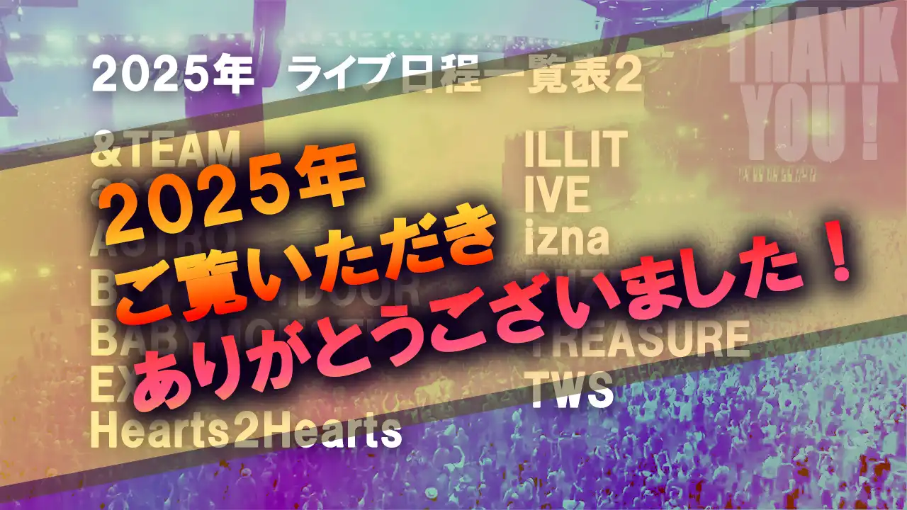 当ブログで記事にさせて頂いている、または当ブログ主が聞いたことのある、または人気と思われるK-POPアイドルのライブ/イベント日程を一覧化(並びはabc順)しました。情報源は公式サイトやX、インスタグラムなどです。基本的にはステージ上で行われるもの、ライブ系のものを抜粋し、記事作成日(2025年4月)以降のライブ/イベント日程を記載します。過ぎたものは打ち消し線(例:1月1日)でラインを引きます。